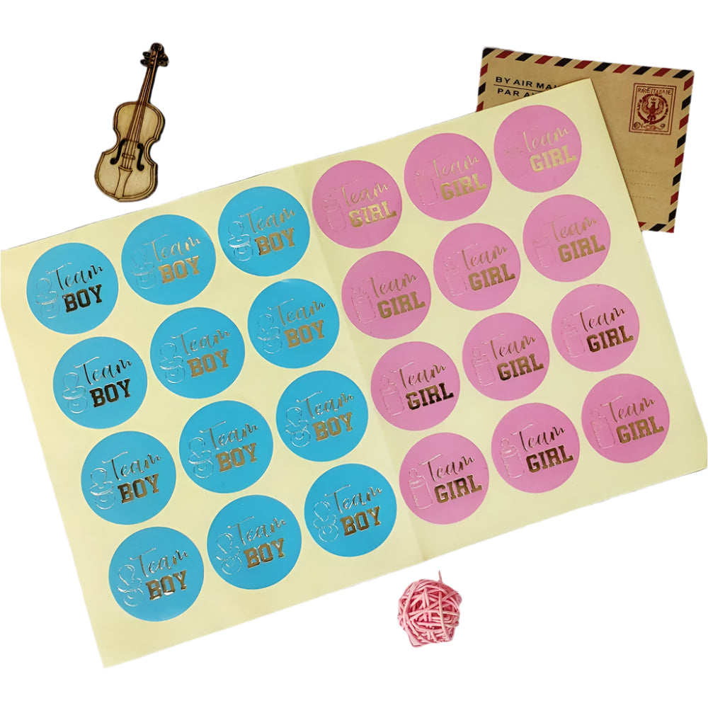 Låt gästerna visa vilket team de tillhör! Dessa färgglada klistermärken är perfekta att fästa på kläder, glas, presenter eller gästpåsar under könsavslöjande fest eller babyshower.