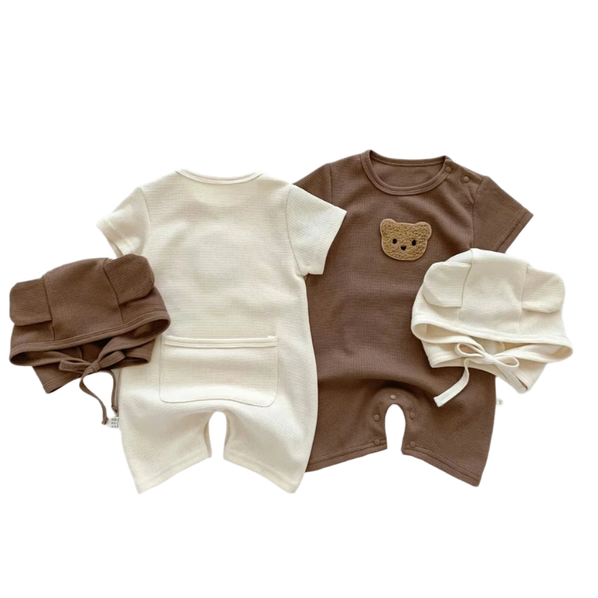 Sommardräkt för Bebisar – Waffle Jumpsuit med Björnpatch & Söt Mössa